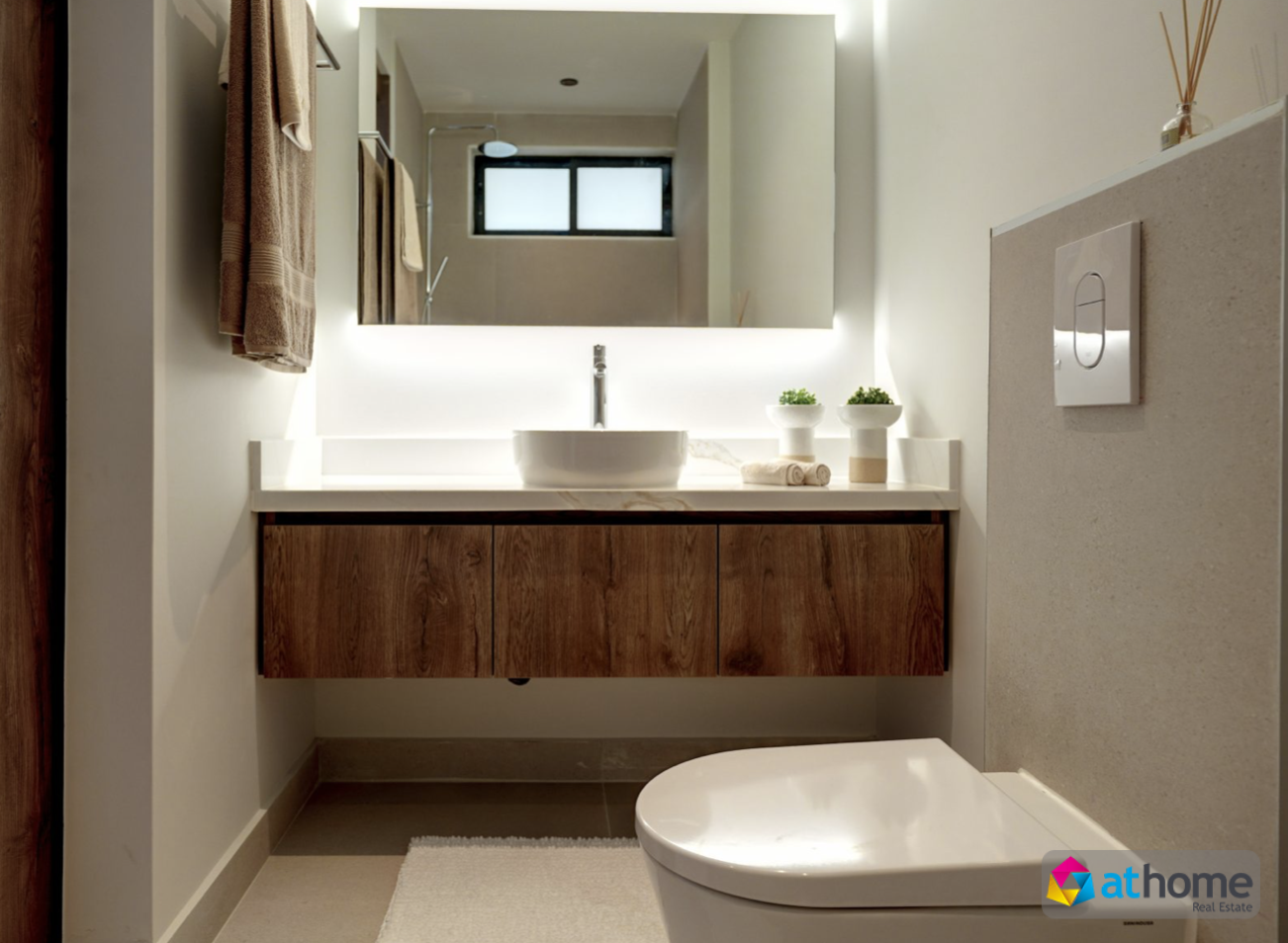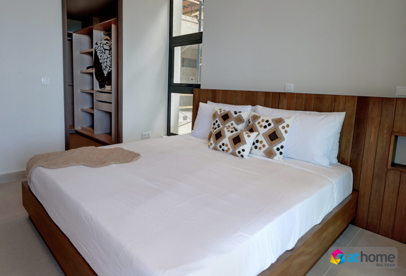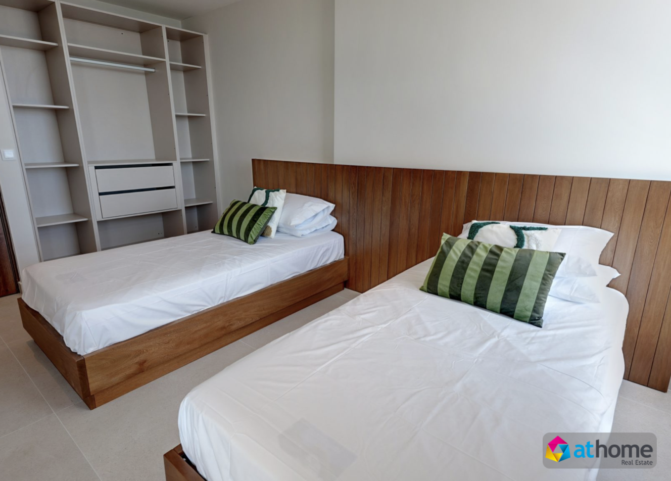 The master bedroom has a comfortable bed, custom wood accents and a private en-suite bathroom. The second bedroom is bright and versatile, with single beds and built-in shelves, perfect for guests or family. Both bathrooms have elegant finishes, spacious showers and a spa-like ambiance.