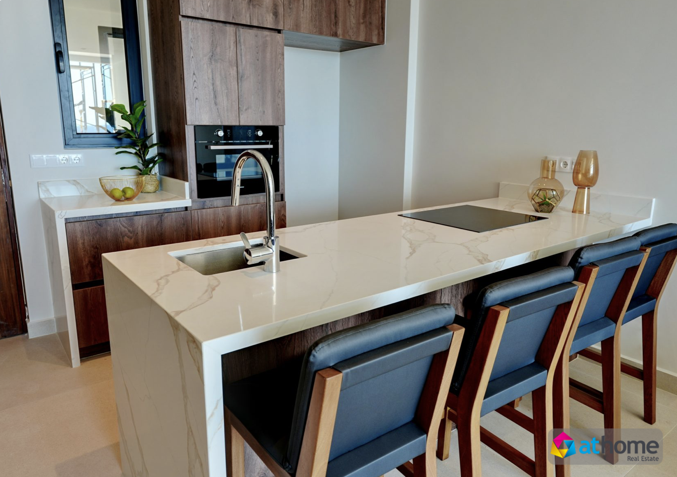 The open living room is bright and spacious, with large windows and sliding doors to a private balcony overlooking the ocean. The modern kitchen features high-end appliances, a stylish island with a quartz countertop and plenty of storage space. Ideal for culinary enthusiasts.