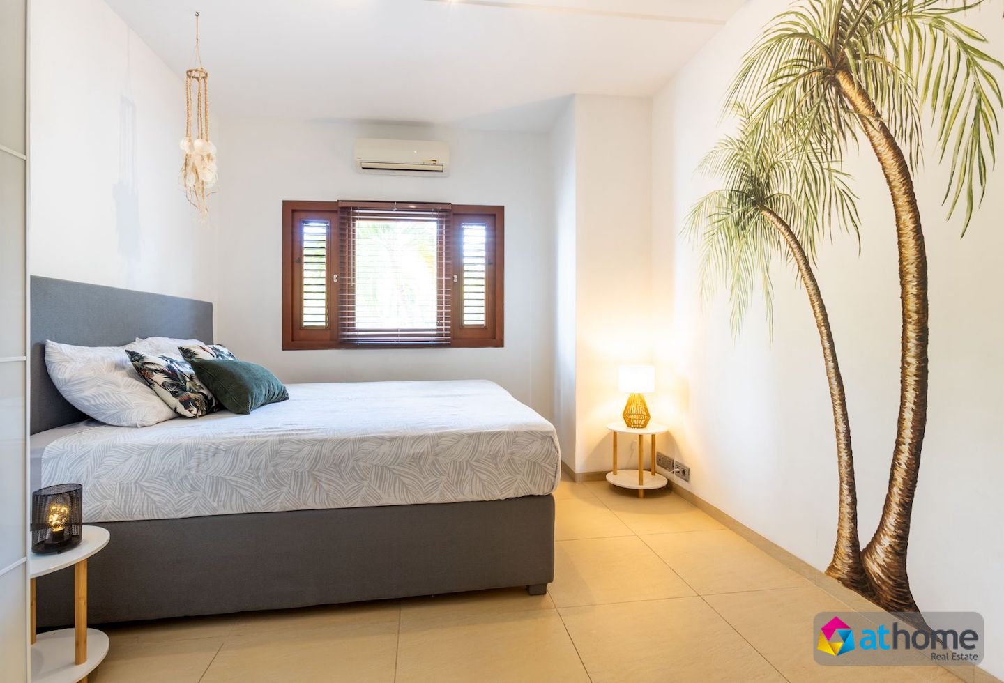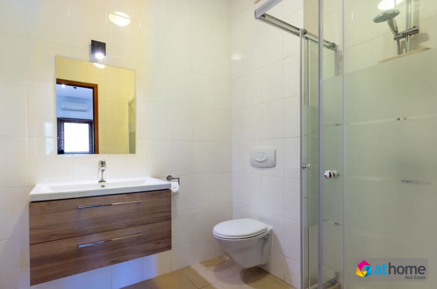 De master bedroom beschikt over airconditioning en een stijlvolle en-suite badkamer met douche, wastafel en zwevend toilet. De tweede slaapkamer is eveneens voorzien van airconditioning, met een tweede badkamer met douche en wastafel. Daarnaast is er een gastentoilet en een aparte wasruimte met wasmachine, droger en warmwaterboiler.