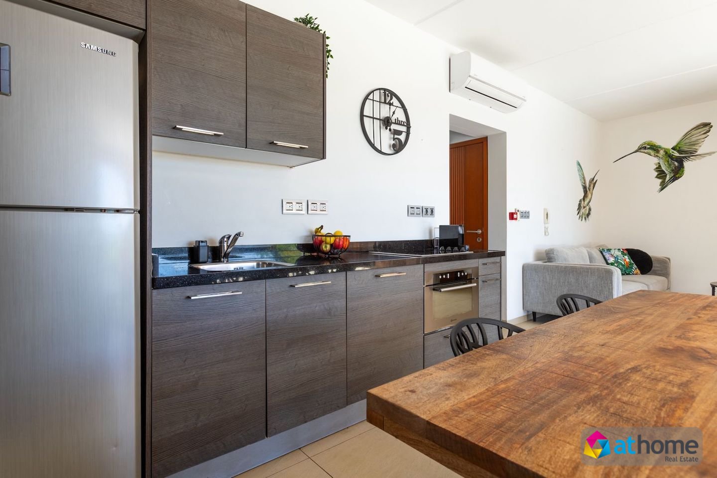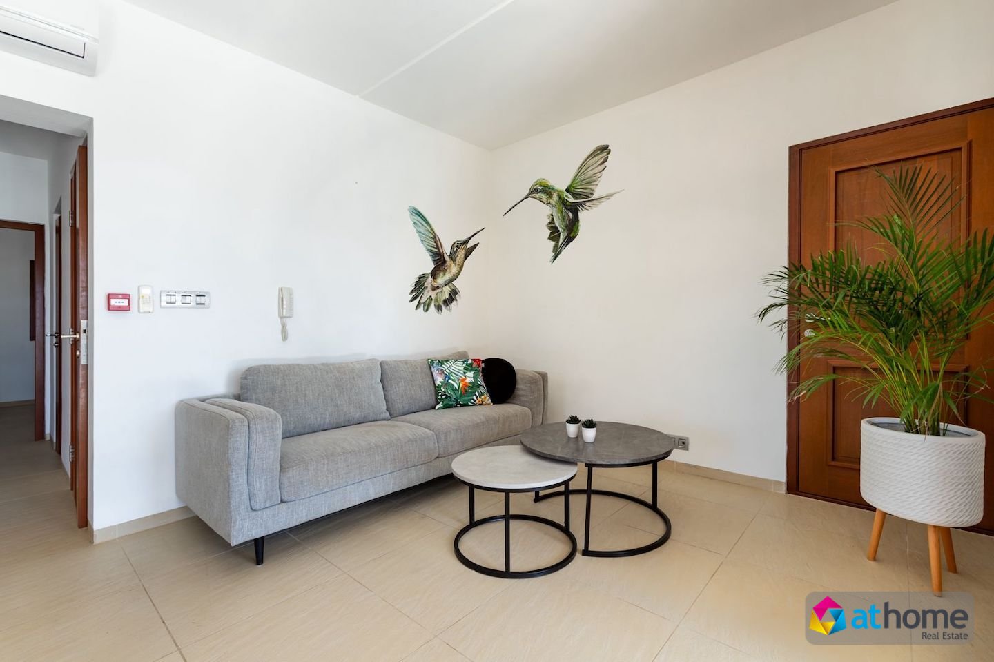 Het appartement bevindt zich op de eerste etage van gebouw E en heeft een eigentijdse indeling met twee ruime slaapkamers en twee moderne badkamers. De woonkamer is licht en ruim dankzij de hoge plafonds en grote ramen. De open keuken is volledig uitgerust met inbouwapparatuur, waaronder een kookplaat, afzuigkap, koelkast, oven, vaatwasser en spoelbak. Zowel 110V als 220V aansluitingen zijn aanwezig.