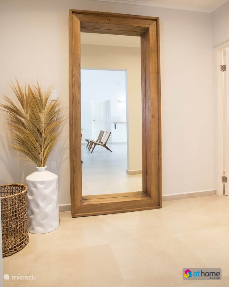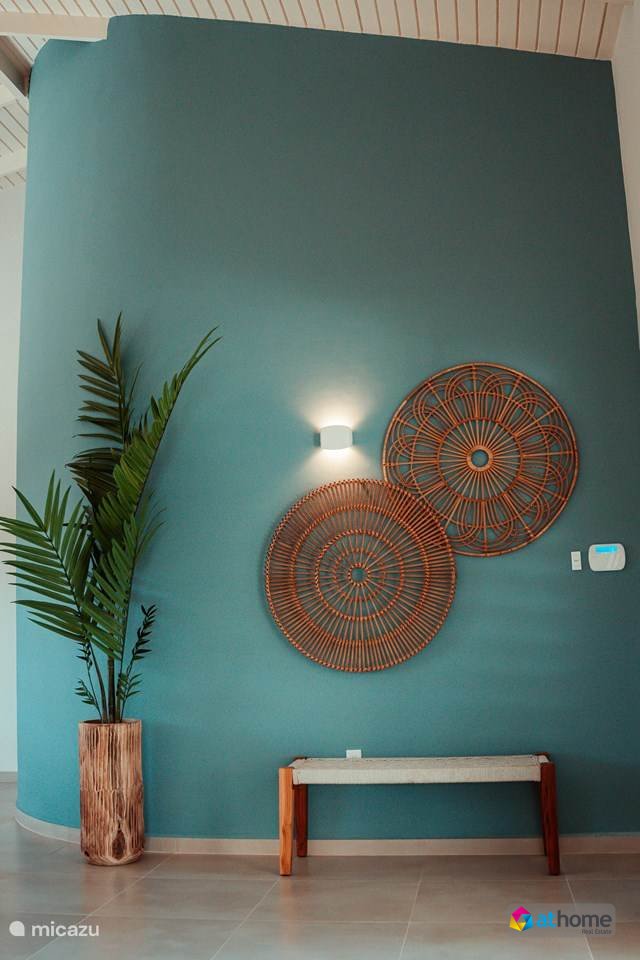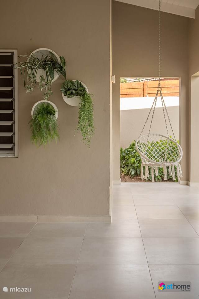 De entree biedt toegang tot de ruime voorkamer. De voorkamer is verbonden met de woonkamer en open luxe leef keuken. De woonkamer is royaal en verbonden met de overdekte porch. Dit maakt het ideaal om binnen- en buitenleven met elkaar te combineren. Vanuit de porch is er zicht op de tropische tuin met gazon en het zwembad.