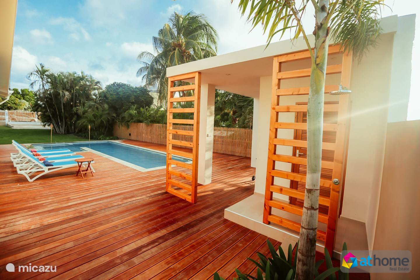 De tuin is tropisch aangelegd en door de aanwezigheid van een deepwell is het gazon altijd prachtig groen. Er is een ruim zwembad aanwezig van maar liefst 4 bij 10 meter. Daarnaast is er nog een jacuzzi gedeelte van maar liefst 2 bij 4 meter. Om het zwembad ligt een ruim pooldek met een oppervlakte van 140 m2. Er zijn een buitendouche en een gastentoilet aanwezig bij de poolarea.