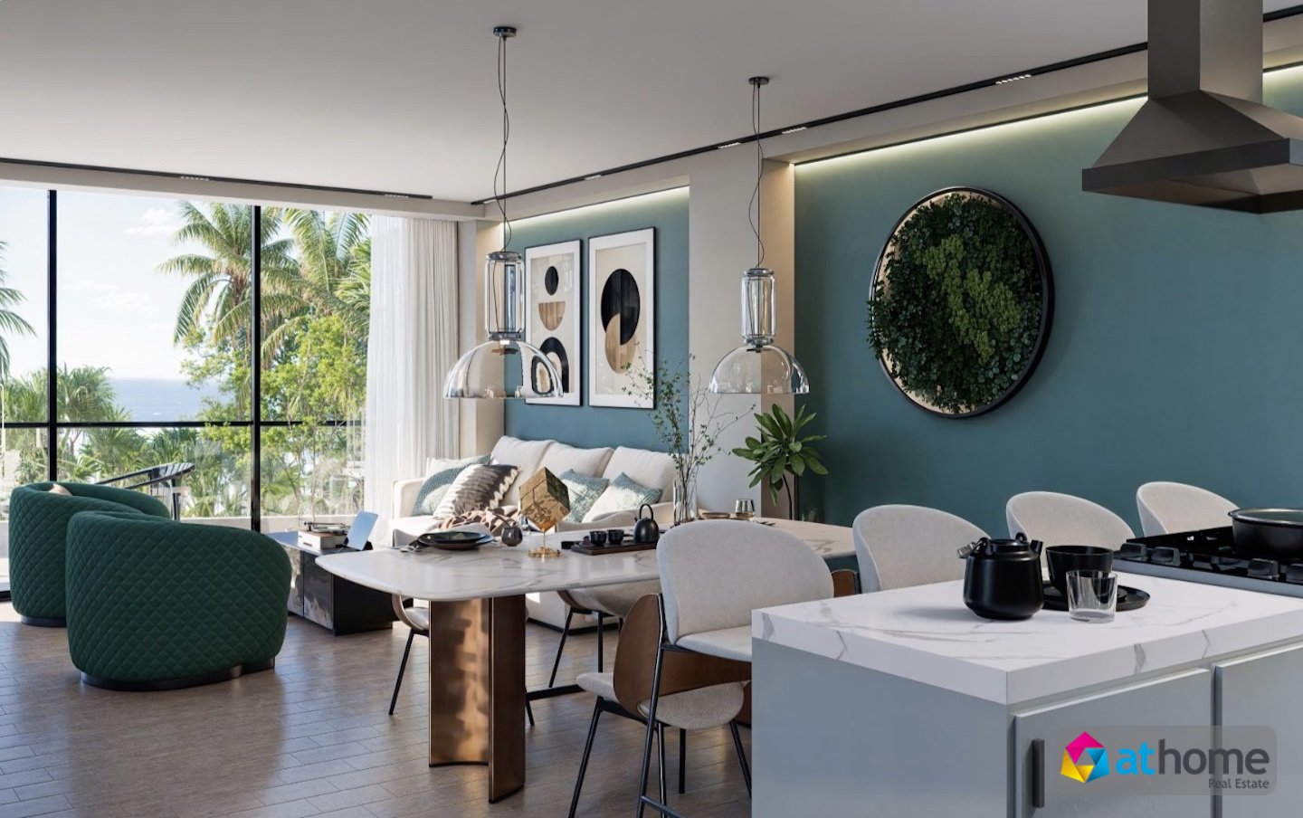 De open woonkamer en keuken vormen het hart van het appartement. De keuken is modern uitgevoerd en voorzien van inbouwapparatuur zoals een oven, elektrische kookplaat, afzuigkap, koelkast en vaatwasser. De ruime woonkamer biedt via schuifdeuren toegang tot het balkon, waar u kunt genieten van een prachtig uitzicht op de oceaan.