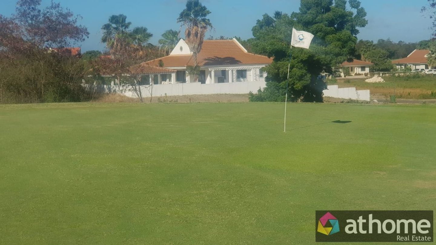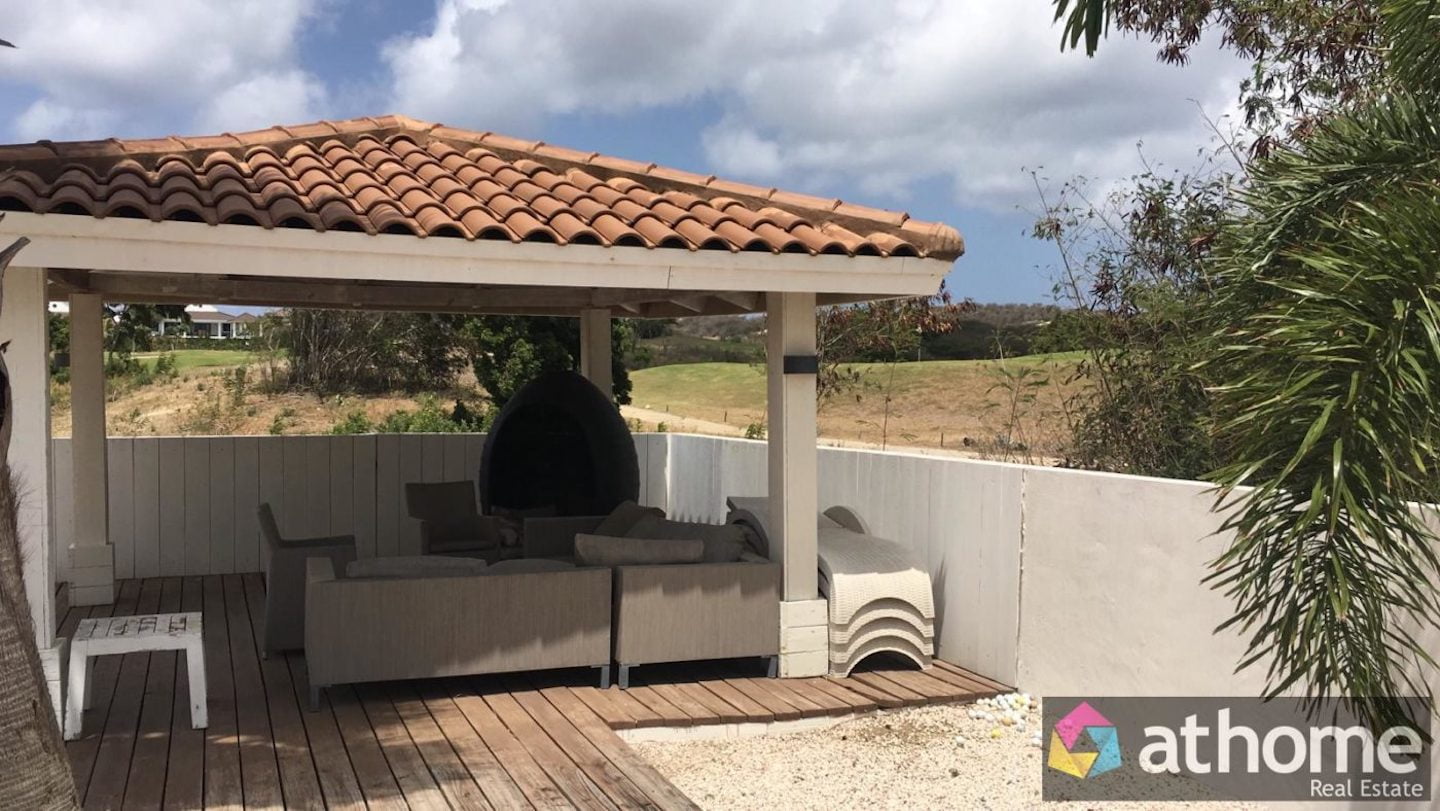 Mooie Tropische Villa met Zwembad op Blue Bay Te Huur. Deze moderne tropenvilla is gesitueerd op de J-sectie van het mooie Blue Bay Golf & Beach Resort Curacao met een 18-holes golfbaan, tennisbanen, restaurants, een duikschool, winkels en strand. De villa is gebouwd in 2016 en heeft een ruime living met open keuken, 4 slaapkamers, 2 1/2 badkamer, carport en een privé zwembad, gelegen aan de golfbaan,  op een hoger gelegen ruime kavel gebouwd en maakt hierdoor een statige indruk in deze wijk. Er is een overdekte entree, aansluitend de mooie ruime living met een hoog plafond en daardoor nog ruimer oogt. De woonkamer heeft een grote schuifpui die uitkomt op het terras, tuin met zwembad. Het is echt een tropisch concept met veel licht en ventilatie door middel van veel ramen, deuren en overdekt terras. Linksachter van de woonkamer bevindt zich de keuken met diverse inbouwapparatuur. Het is een open keuken die net als de woonkamer ook aan het overdekte terras grenst aan de achterkant van de villa. De villa beschikt over totaal 4 ruime slaapkamers. De hoofdslaapkamer ligt aan het terras achter de villa, met uitzicht op de achtertuin en het zwembad. Deze zeer ruime slaapkamer heeft een eigen badkamer met dubbele wastafel, douche en toilet. Daarnaast bevinden zich ook 3 gastenslaapkamers met een gedeelde moderne badkamer. Er is ook bergruimte voor de wasmachine en droger en verder is deze groot genoeg als opslagruimte voor allerlei spullen. Het terras achter grenst direct aan het luxe zwembad. Rondom het zwembad ligt een houten dek. Links achter in de tuin staat een ruime gazebo, waar er heerlijk kan worden gerelaxed. Rechts achter in de tuin is er een nette berging en het pomphuis gelegen. De tuin is bedekt met siergrind en heeft al verschillende mooie volgroeide palmen. De tuin is compleet ommuurd en kijkt achter op bomen uit en links is er uitzicht op de golfbaan. Naast de villa is  er een pad met klinkers die leidt naar de carport. Voordelen van deze woning: -Prachtig en populair model tropenwoning -Reeds gebouwd en direct gereed om te passeren -Mooi hoog, op de wind gelegen en tevens geen problemen met hevige regenval -Mooi ruim zwembad met een gazebo in de tuin -Ruime kavel -Pad met klinkers naar carport -De villa wordt voor een scherpe prijs aangeboden, zodat de koper nog aanpassingen en verbeteringen aan de villa kan aanbrengen. Tevens zijn er nog 5 aircos, alarmsysteem en cameras Bebouwde oppervlakte is circa 300 m2 Kavel grootte is circa 1.200 m2.